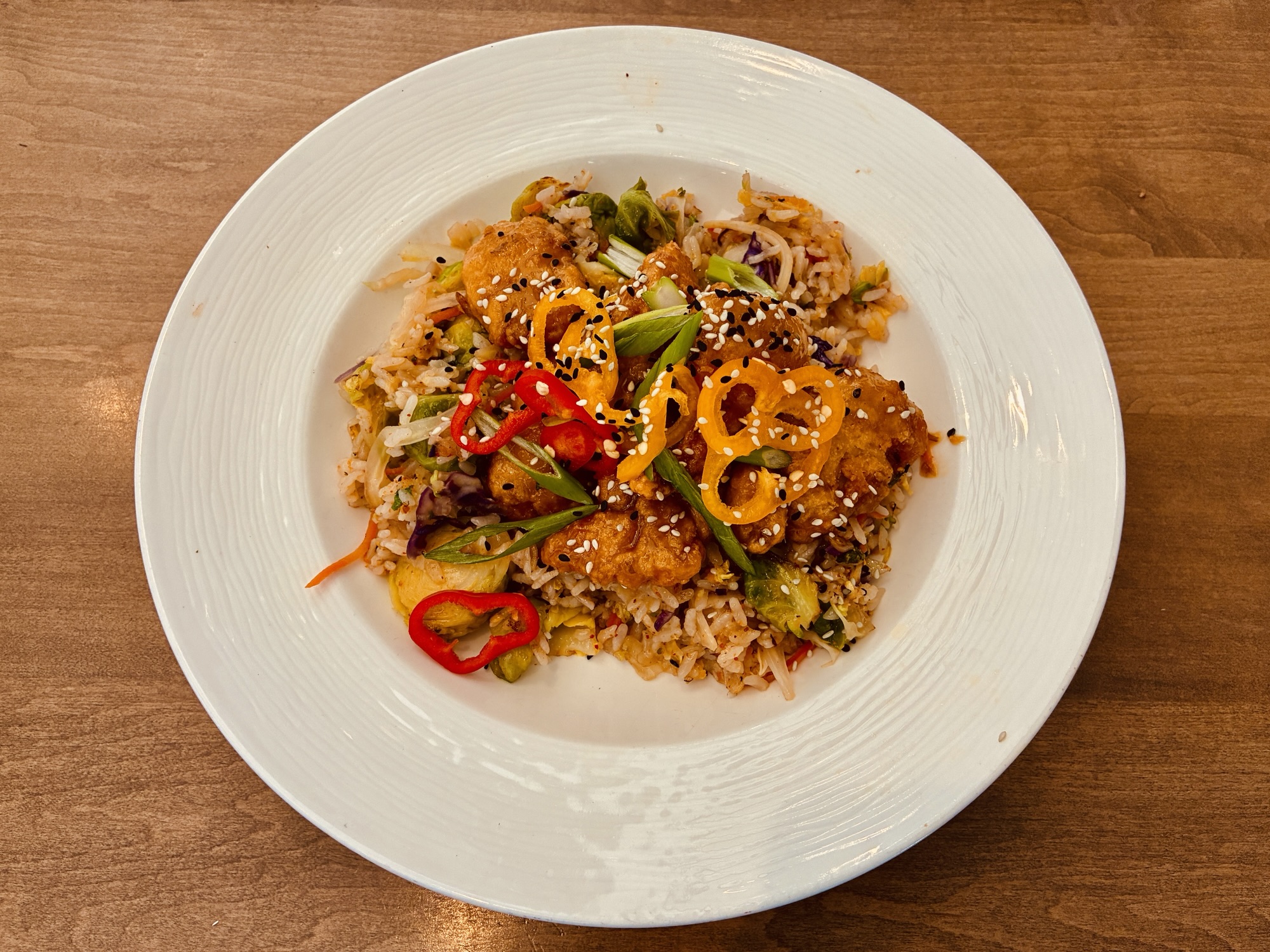 Plated entrees return to a lightly Asian theme with choices like miso salmon and orange ginger chicken. The former is a satisfying slab of fish served over noodles interspersed with slivers of sweet potatoes. The latter is an elevated take on a classic entree from American Chinese restaurant menus with chunks of tender breaded poultry with notes of orange, ginger, garlic throughout. The result is a noticeable but not overwhelming spice level. Brussels sprouts and sliced peppers add some vegetable goodness to the protein placed over the base of rice.