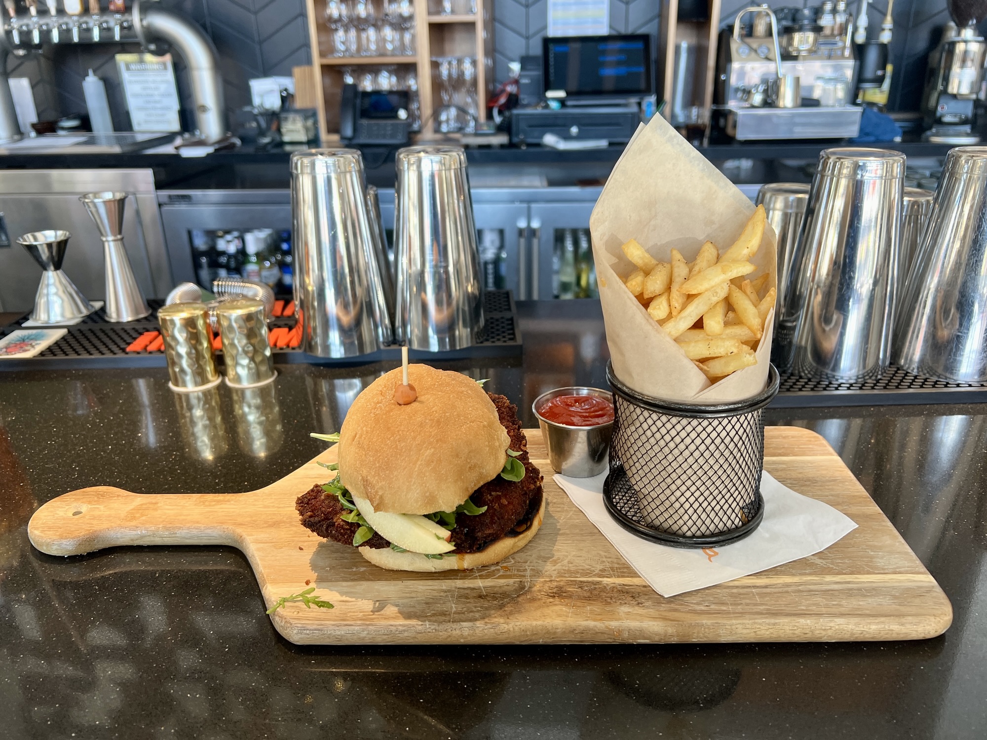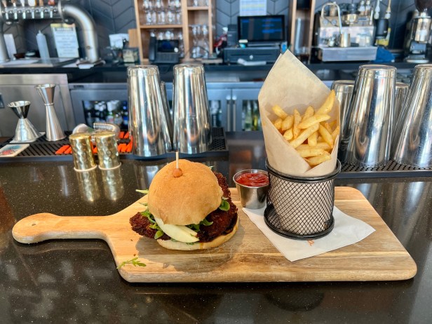 For lunch, most of the dinner entrees are reformatted as bowls with an underlying layer of either sticky rice or chow mein noodles. In addition, there are choices such as a burger and a katsu chicken sandwich. The second item has a panko breading that pairs well with a sriracha honey glaze, a slaw of arugula and apple, and a spicy aioli. Both the burger and the chicken sandwich are paired with a side of crisp fries. For breakfast and weekend brunch, these items are joined on the menu by additional items like Tempe breakfast hash and brioche cinnamon French toast.