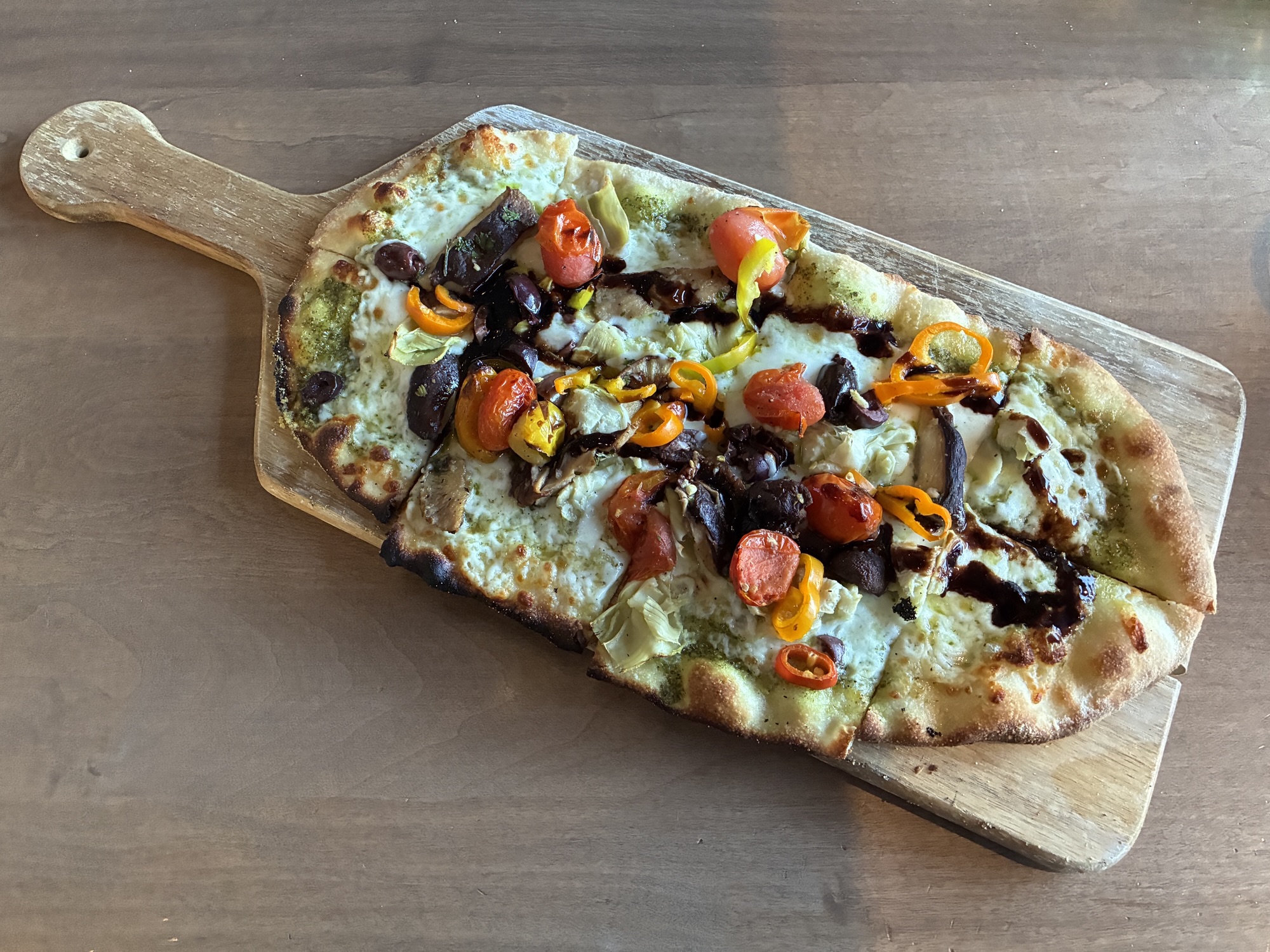 Flatbreads are oblong, thin crust pizzas suitable for sharing. In a departure from much of the menu, these draw primarily from Mediterranean rather than Asian influences. With that in mind, the appropriately named Mediterranean flatbread is full of tart, salty, and umami notes from peppers, artichoke hearts, and roasted tomatoes. Margherita and prosciutto flatbreads are both relatively simple and straightforward while the Calabrian one involves pepperoni and boschetto al tartufo, a semi-soft Tuscan cheese from a blend of pasteurized cow’s and sheep’s milk.
